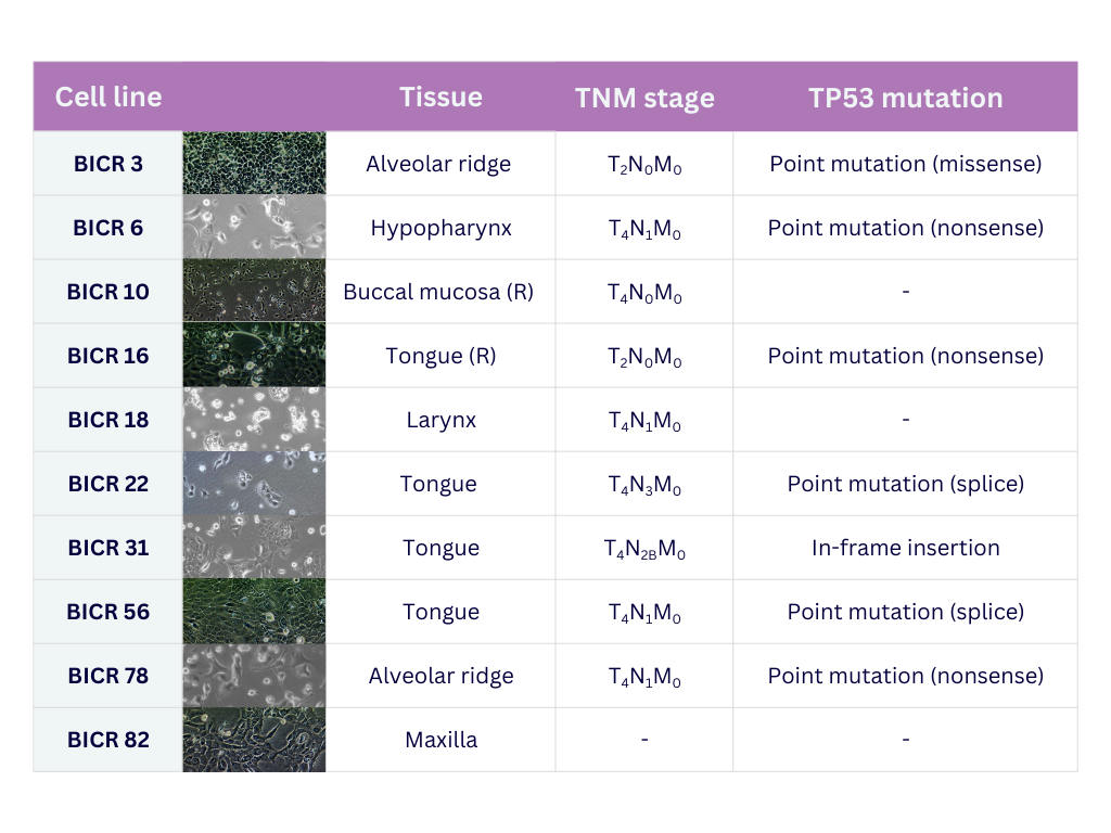 - Description: Adherent keratinocyte cell line derived from a squamous cell carcinoma of the oral alveolus of a Caucasian male. Keratin and involucrin markers present. Known mutations: p53, p16 and p14ARF. Cells are not tumourigenic in athymic mice.