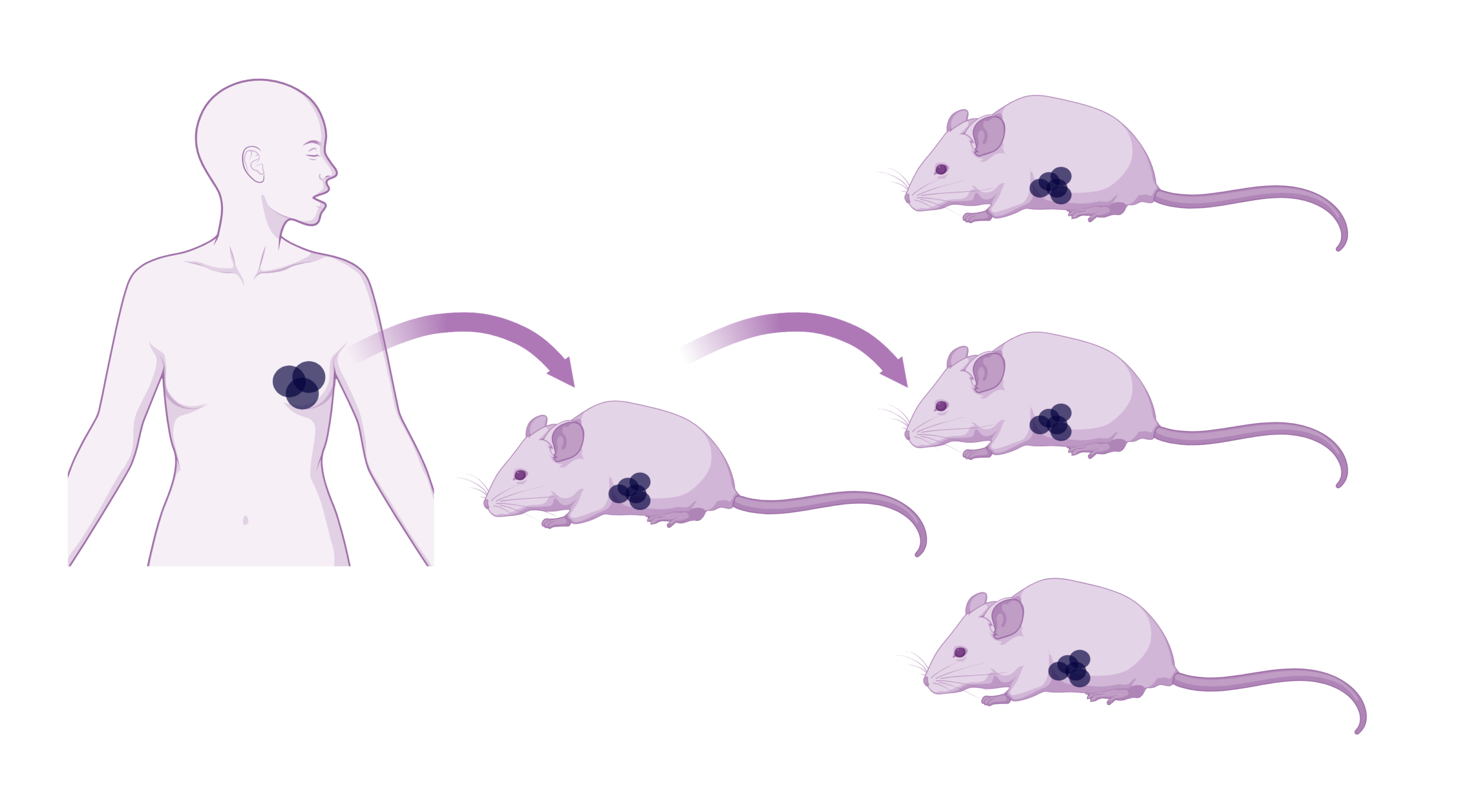 PDX models are created by transplanting human tumour tissue into immunodeficient mice. Our collection of breast cancer PDX models includes those from patients affected by the most advanced and lethal forms of breast cancer, such as aggressive, metastatic and treatment resistant subtypes. PDX models are superior in recapitulating patient tumour characteristics including spatial structure, intratumour heterogeneity, genomic features, tumour growth rates, metastatic patterns and drug responses. These highly translatable models can be used to enhance and de-risk preclinical in vivo drug validation.